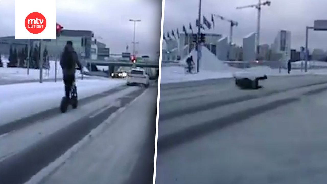 Järjetön näky Helsingin jäisellä valtaväylällä: Sähköpotkulautailija kaahasi päin punaisia – kaatui keskelle tietä