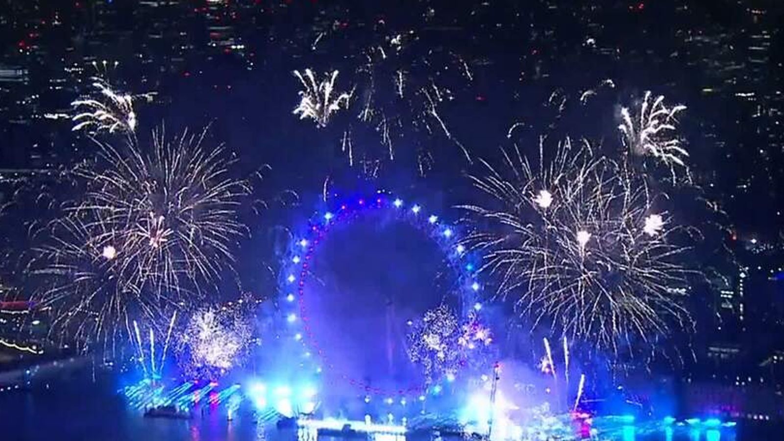 The 12-minute show begins with the familiar sounds of Big Ben's chimes, before thousands of fireworks and hundreds of lights illuminate the night sky around the London Eye, set to a soundtrack.